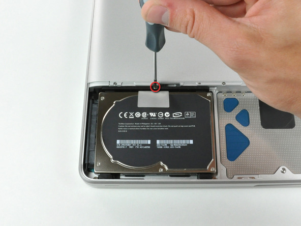 Next step was to install the SSD on my MacBook. I used a Phillips #0 screwdriver to remove the single screw holding the HDD caddy bracket in place. After several attempts I ended up ruining the cross head.